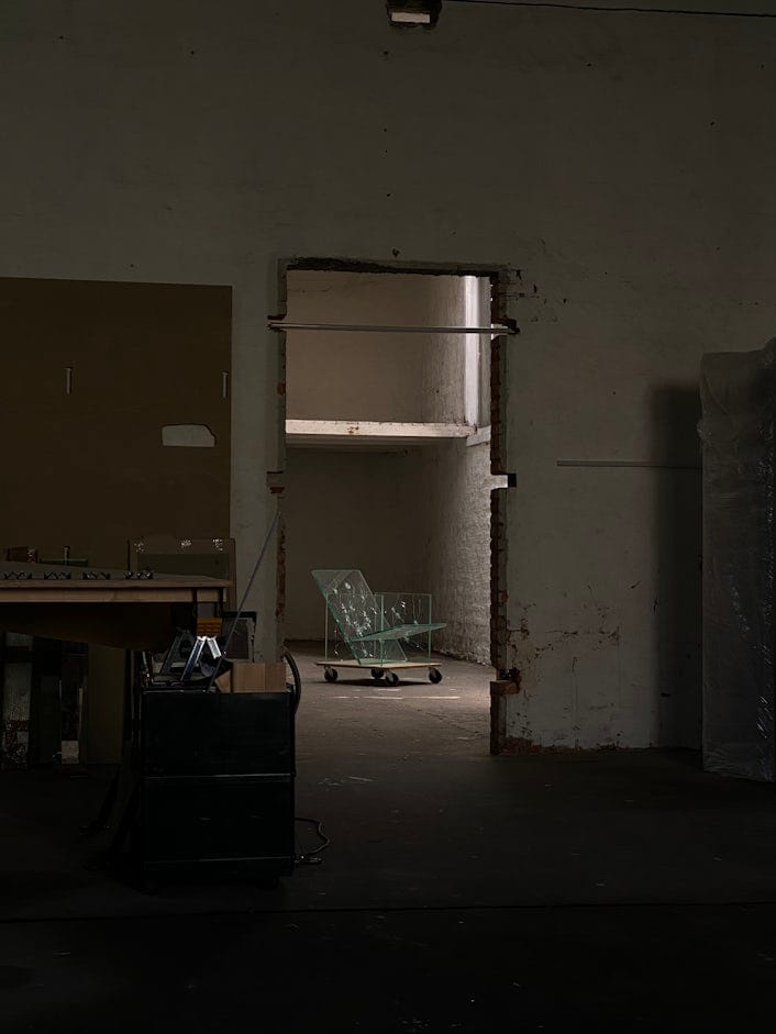 Located on the outskirts of Antwerp, Thibeau works out of an abandoned fire department planned for demolition in 2025 - an ideal studio for an up-and-coming artist. But right now, the space is filled with 70’s furniture, hanging bicycles, x-rays, aluminium-foiled air vents, and hundreds of pieces of glass.