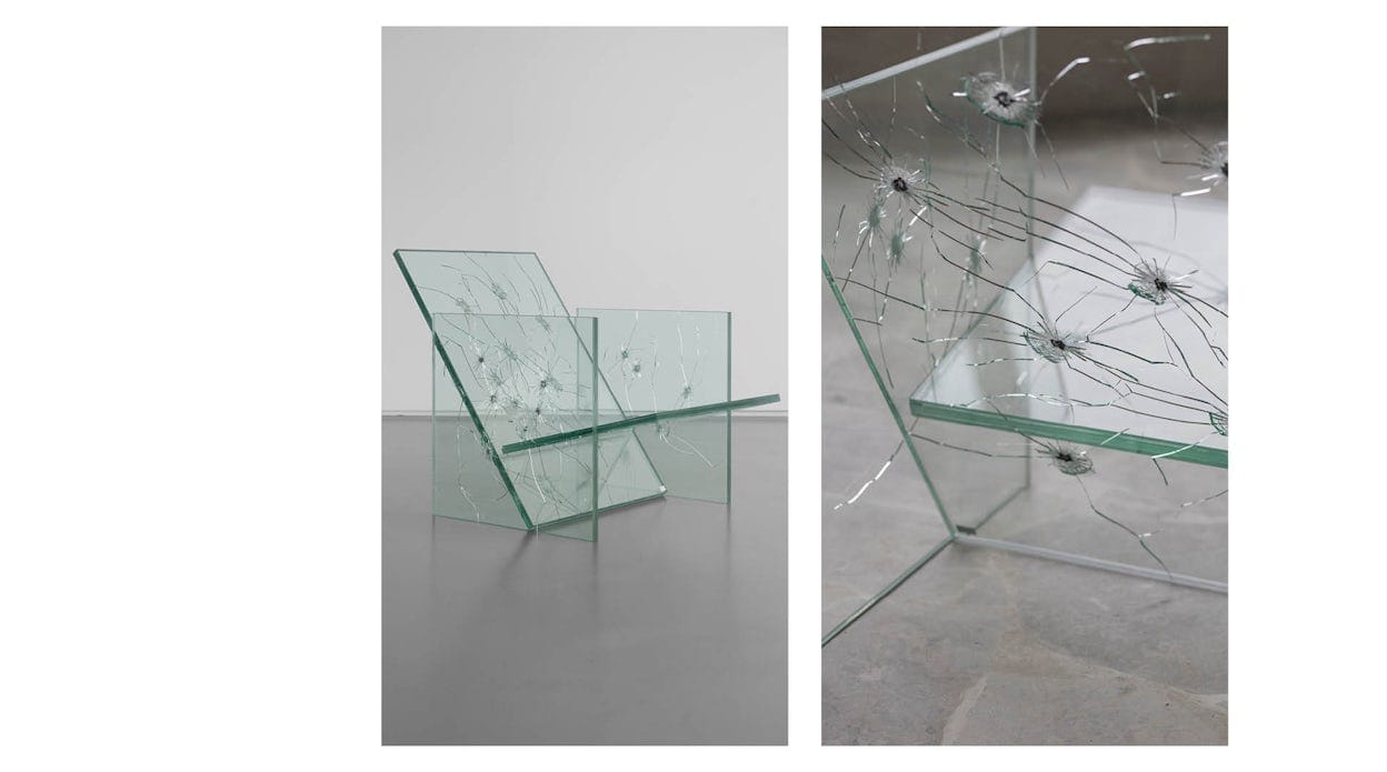 Deeply affected by the Ukrainian-Russian war, Thibeau created a chair from bulletproof glass without visible connections, giving the chair an uninterrupted quality. This seamlessness is, however, broken off by the bullet marks, shattering the glass in multiple places, to represent the fragility of war. The artwork is meant to prompt the viewer to think about the physical and emotional destruction of war and the invisible scars it leaves on individuals and societies.