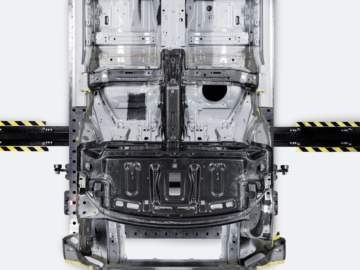 * Eine clever geformte CFK-Einlage wird nahtlos mit dem stählernen Unterboden verbunden. Das führt zu einer Versteifung der normalerweise schwachen Übergangsstelle zwischen der mittleren Bodengruppe und dem Heckaufbau. Bei Polestar heisst diese Komponente „Libelle“.