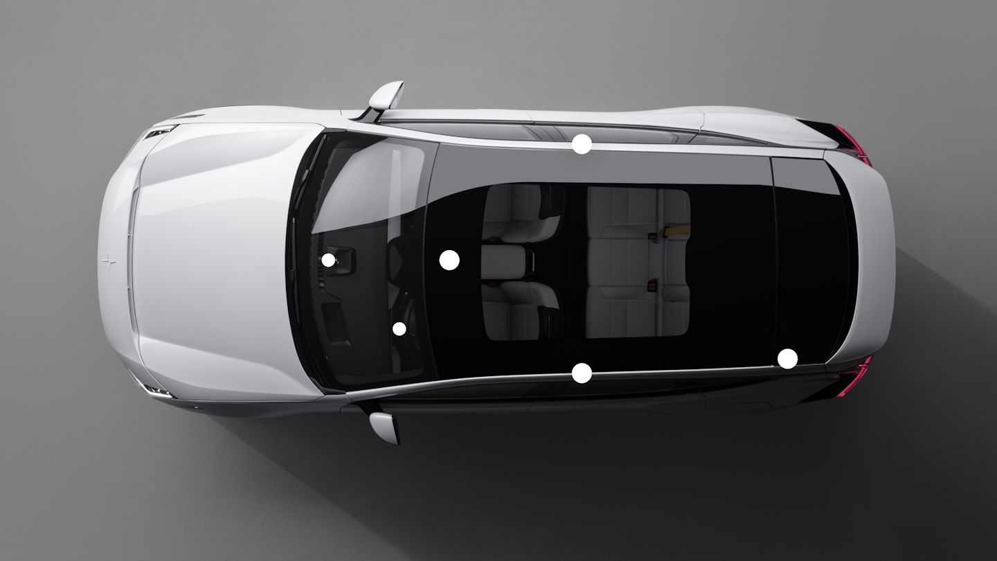 Two buttons on the overhead console make direct calls in case of a breakdown or an accident. The Connect button reaches Polestar Assistance for events like a flat battery or a puncture. The SOS button is intended for emergency situations such as accidents. In case of a severe accident, Polestar 3 automatically calls for help.