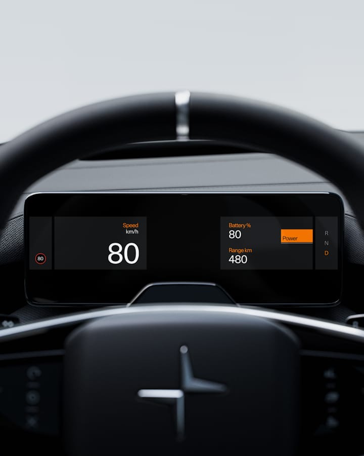Información sin agobios. Las pantallas del Polestar 4 muestran todo lo que el conductor necesita ver, con las mínimas distracciones.