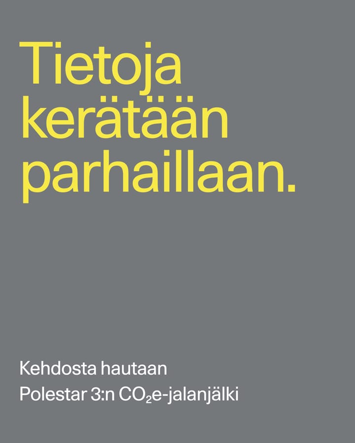 Polestar 3:n valmistuksessa käytetään monia eri materiaaleja, esimerkiksi alumiinia, terästä, elektroniikkaa ja muovia. Jokainen materiaalikategoria vaikuttaa osaltaan auton kokonaishiilijalanjälkeen, samoin kuin tuotannossa ja jalostuksessa käytetty sähkö. Pyrimme jatkuvasti pienentämään hiilijalanjälkeä ja parantamaan sitä koskevien laskelmiemme tarkkuutta.