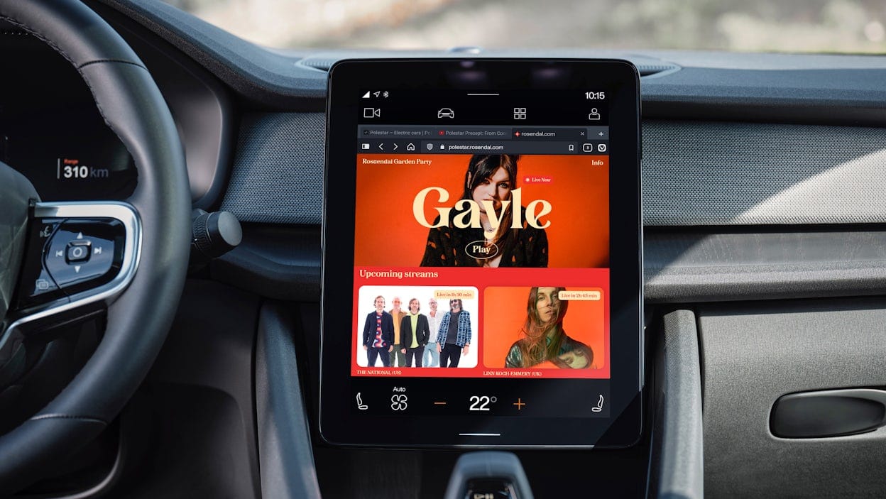 Grâce à notre partenariat avec l’événement Rosendal Garden Party, la Polestar 2 accueillera désormais le premier festival de musique live-streamé d’une voiture au monde, avec des performances de GAYLE, The National, Linn Koch-Emmery et Daniela Rathana. Les conducteurs de Polestar 2 seront en mesure de diffuser un set des artistes susmentionnés chaque soir du festival (voir encadré).