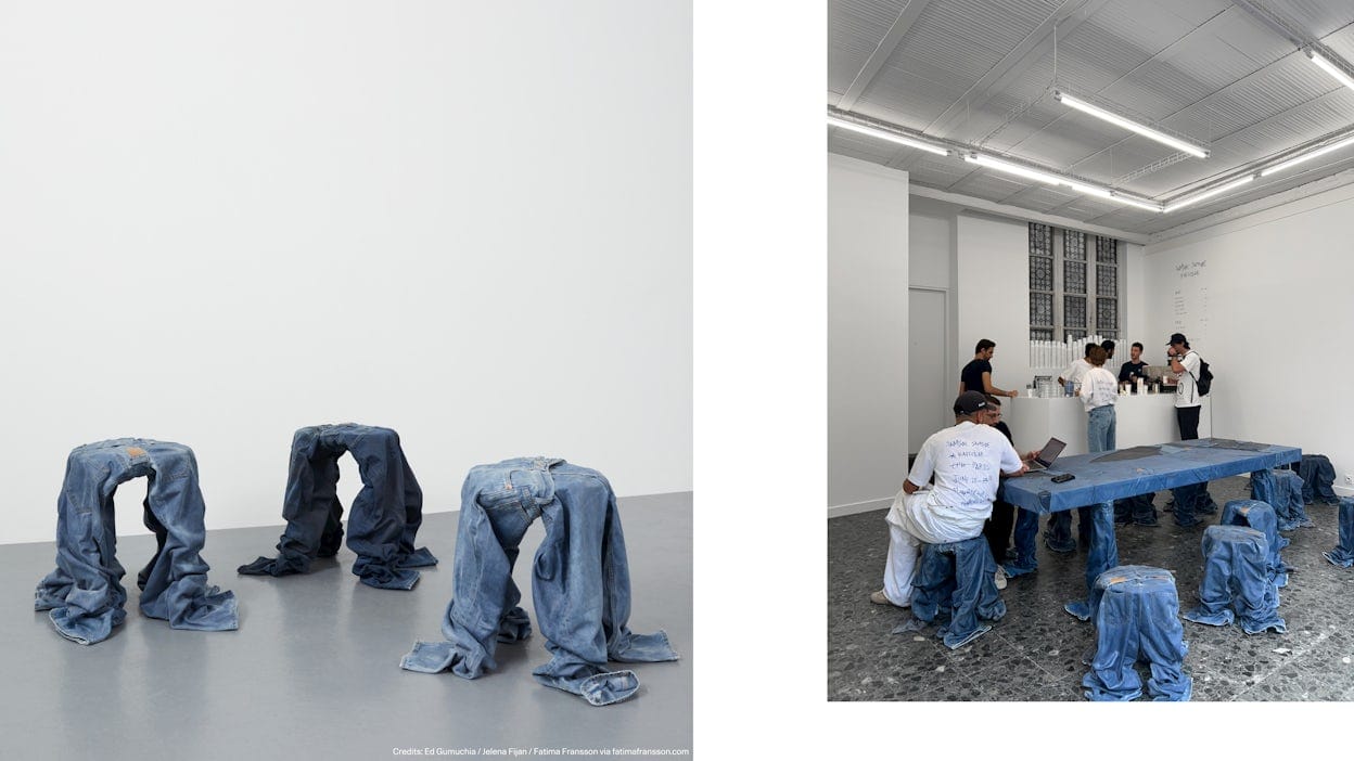 In collaboration with Samsøe Samsøe, Fatima has designed a pop-up coffee shop. The installation consists of a large table with 30 chairs draped in upcycled denim jeans from the Danish fashion brand. The installation sits at the intersection between sustainability, fashion, and art, and is open to the public during Copenhagen Fashion Week.