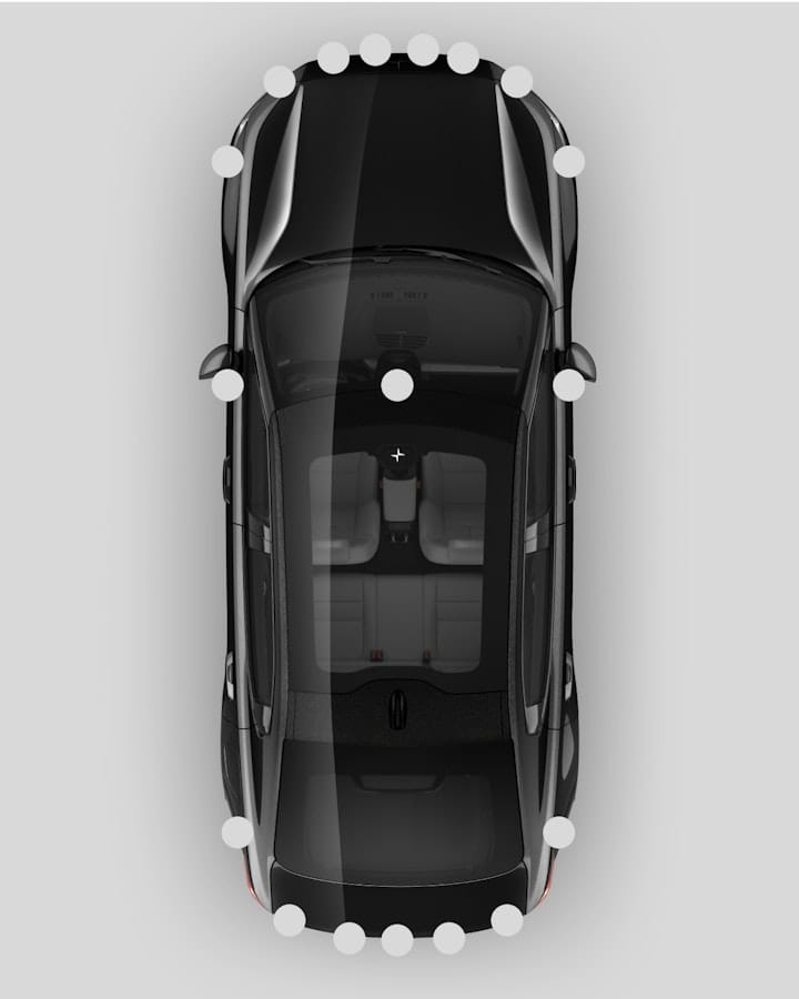 Durante le manovre, Polestar 2 può mostrare sul display centrale una vista a volo d'uccello o una vista posteriore dell'ambiente circostante. Quattro telecamere forniscono una visione a 360° centrata su un'immagine virtuale dell'auto per aiutare il conducente a muoversi in spazi ristretti.