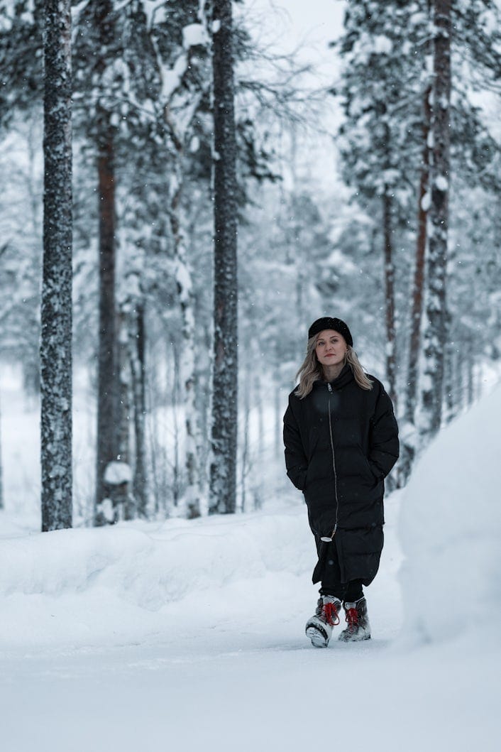 Tanja Sotka walking in the Finnish, snowy, forest