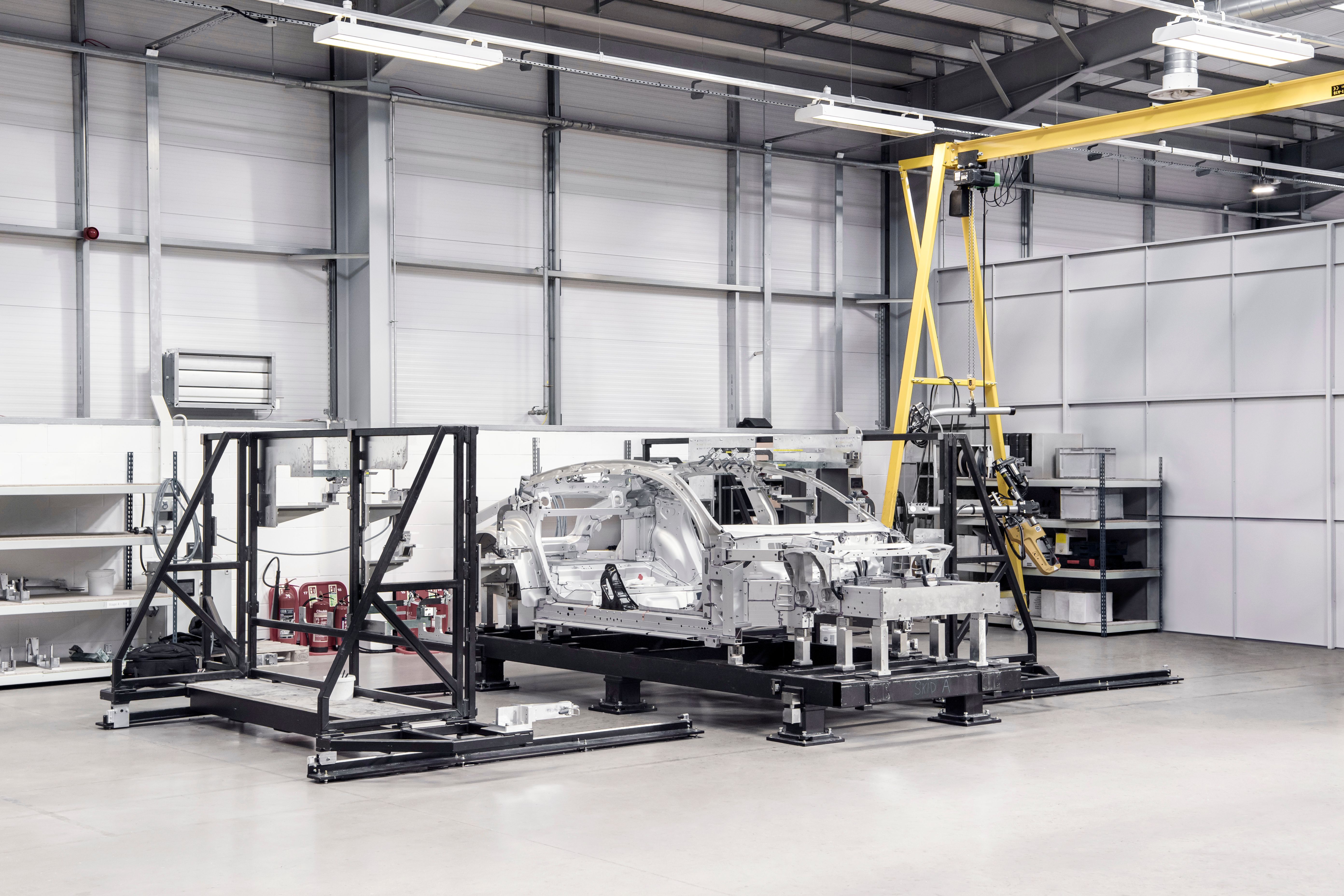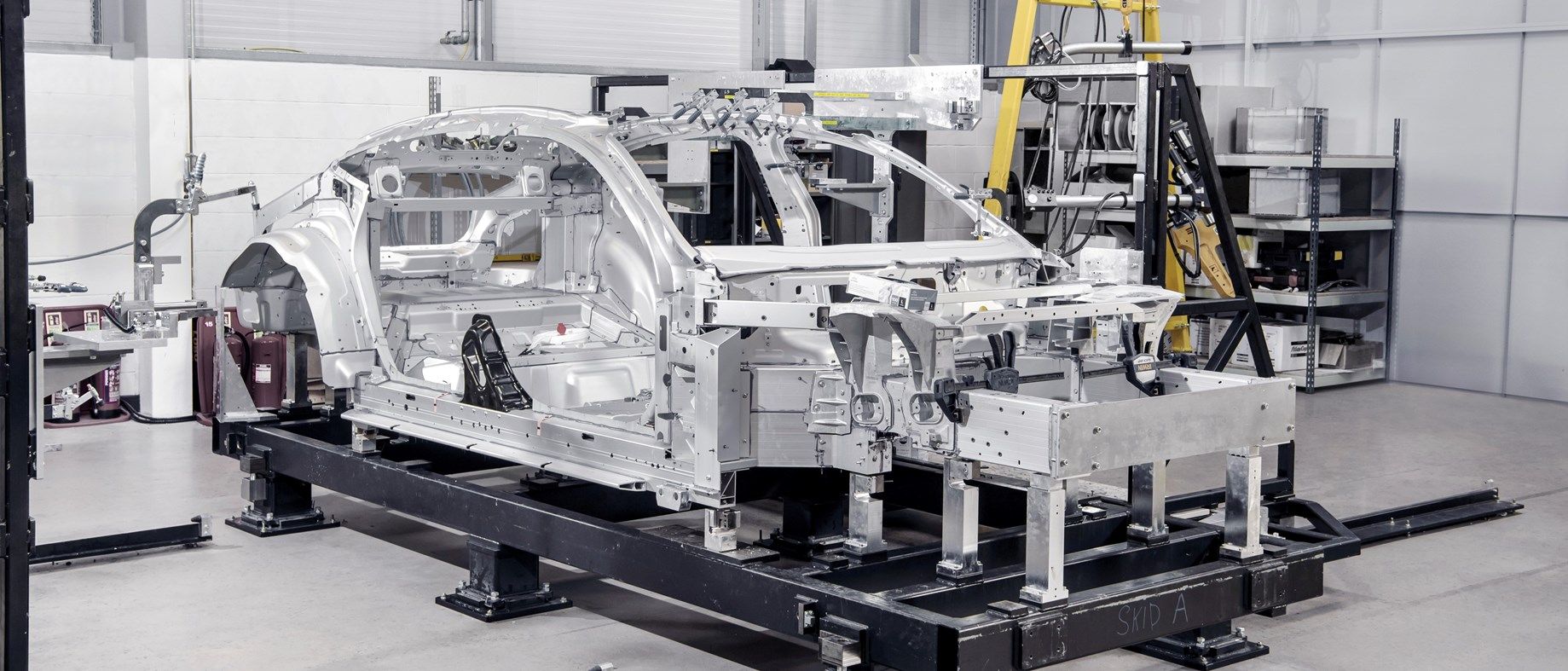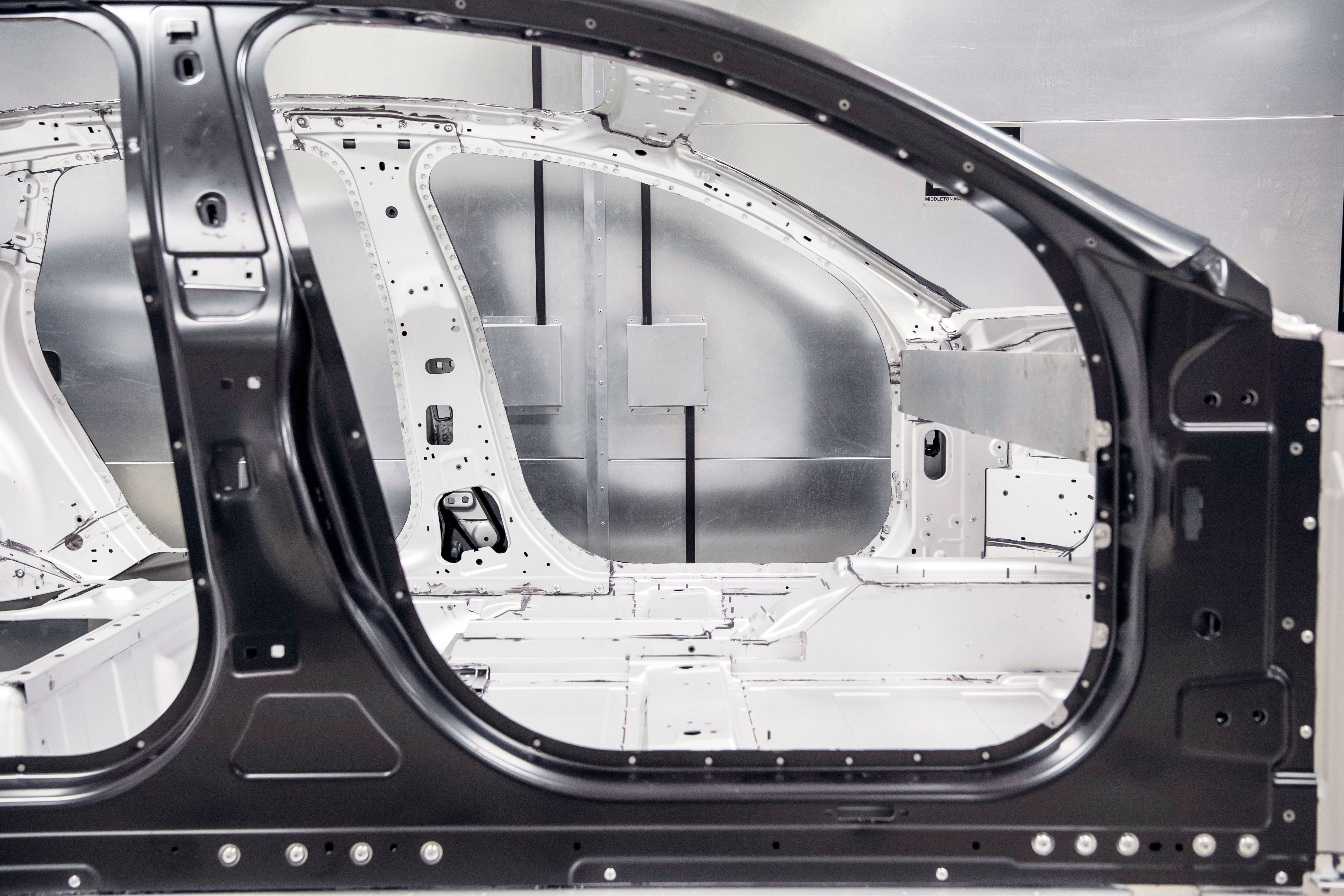 Interior structure of a Polestar car chassis with visible metal framework and welding joints in a workshop environment.