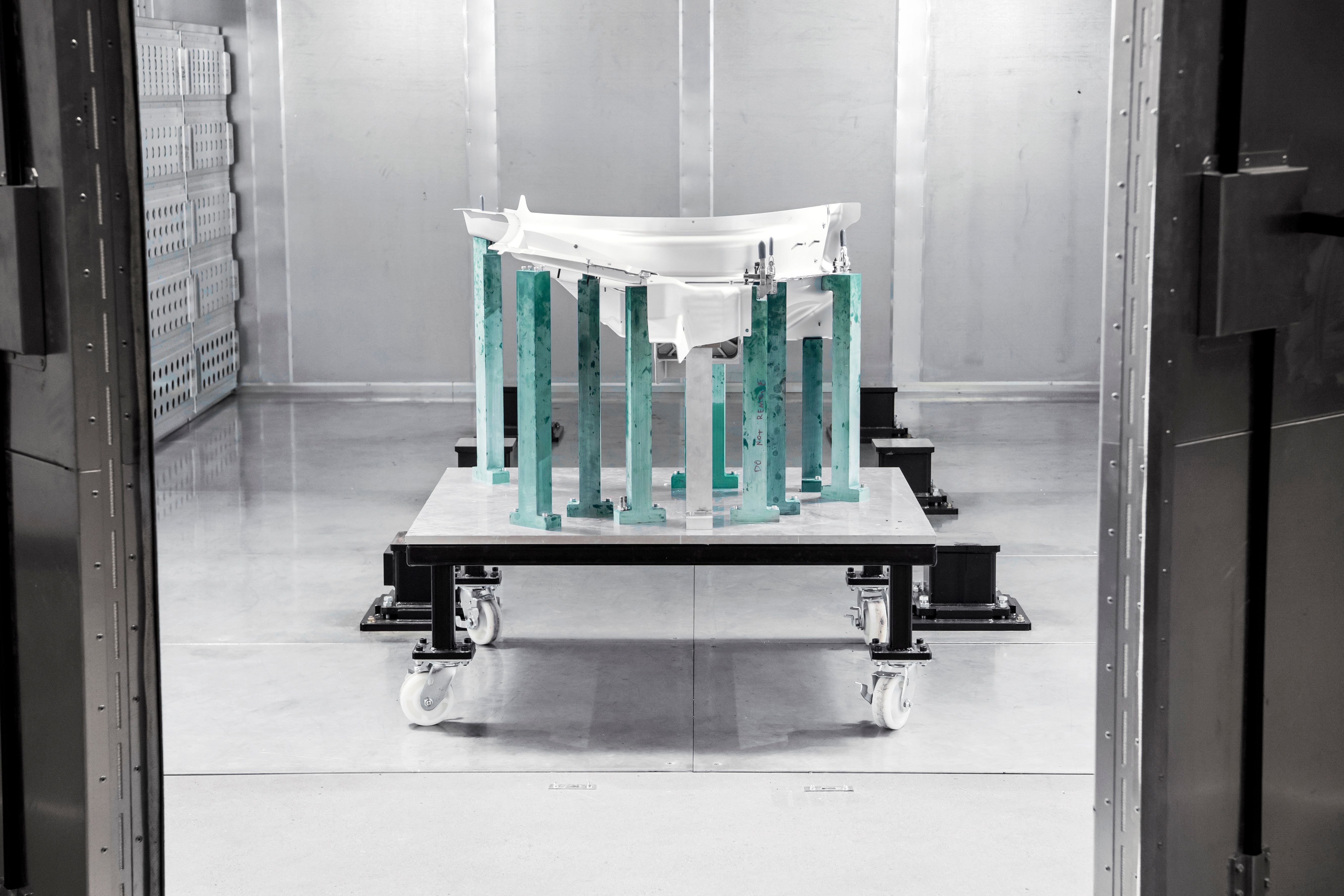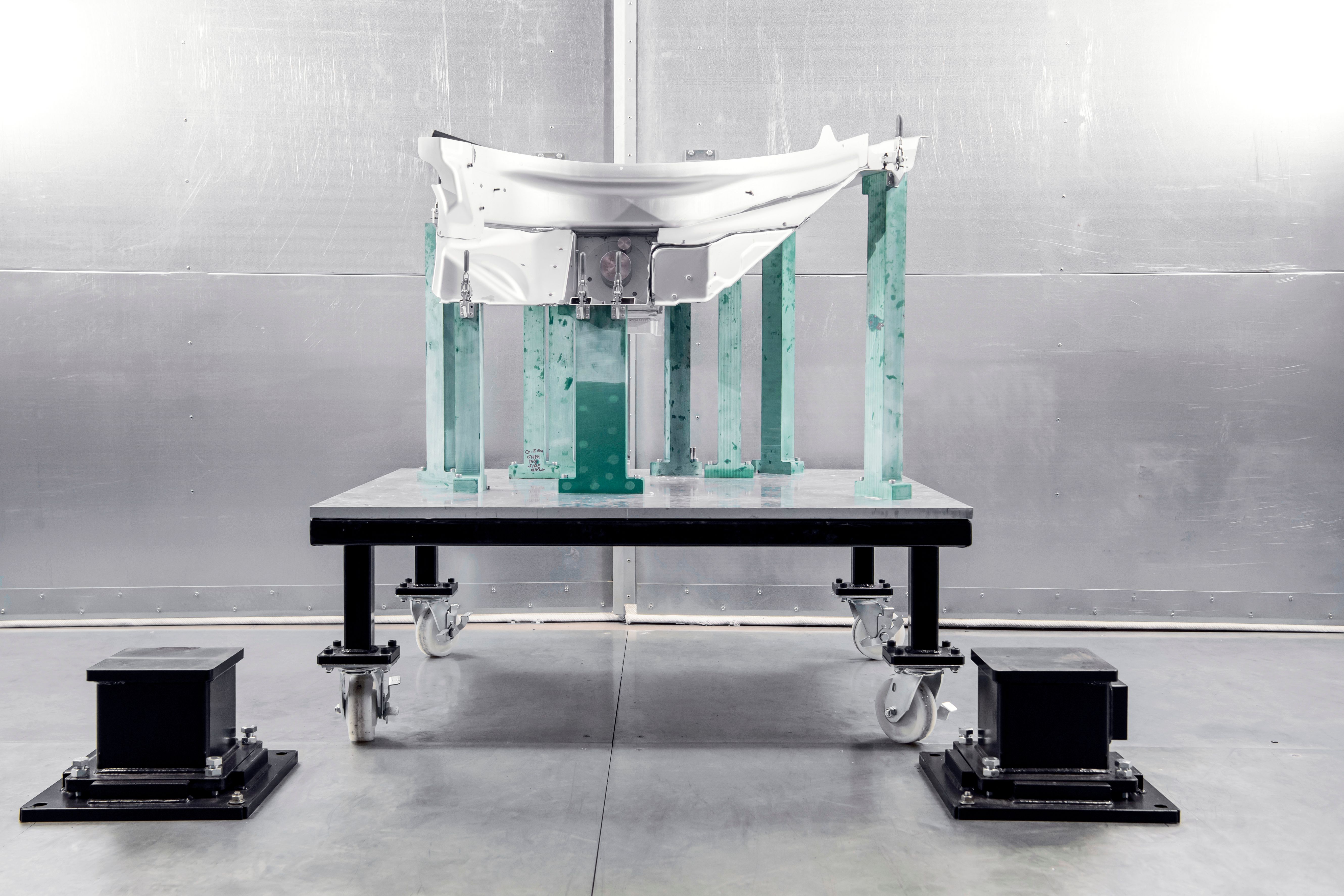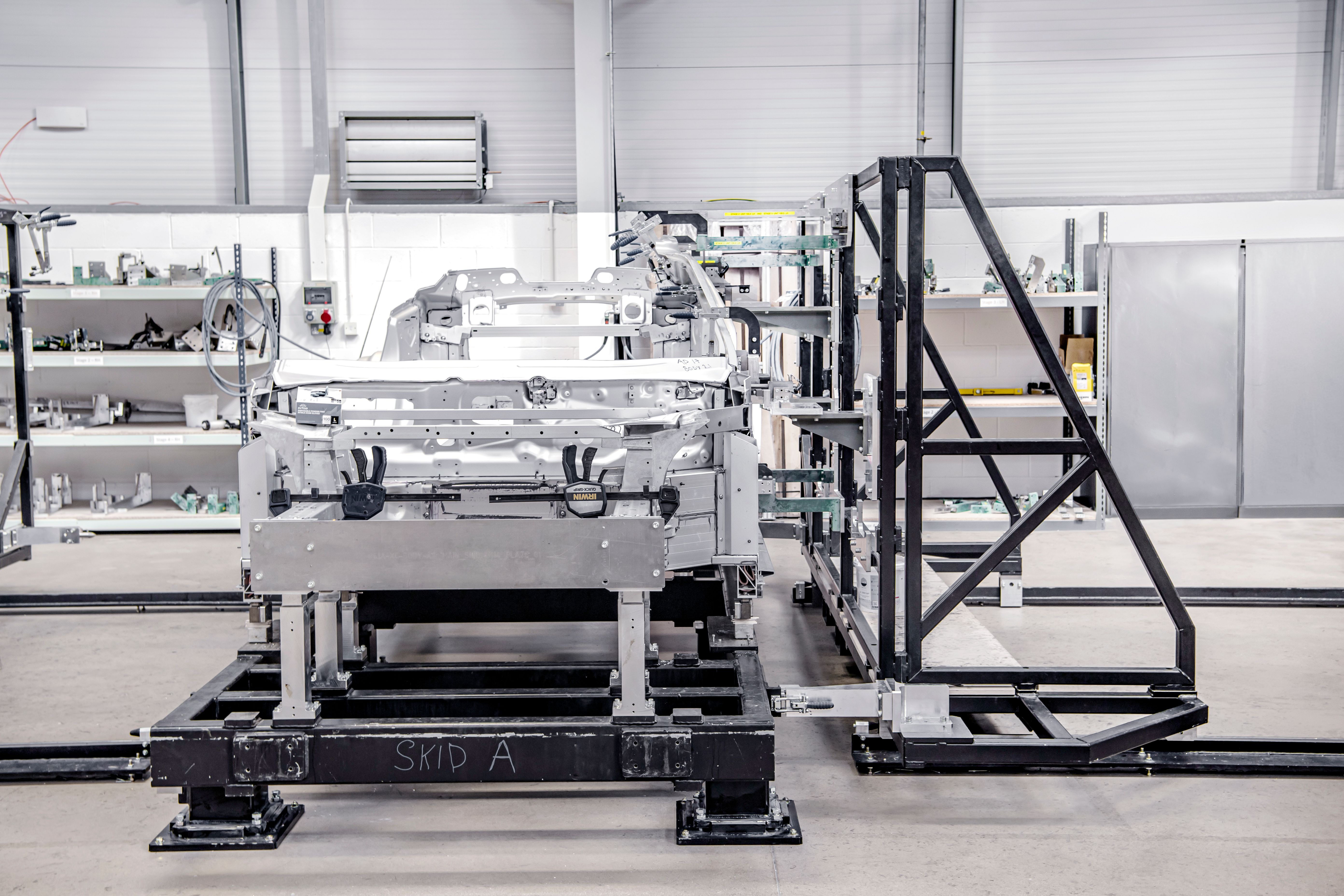 Interior structure of a Polestar car chassis with visible metal framework and welding joints in a workshop environment.