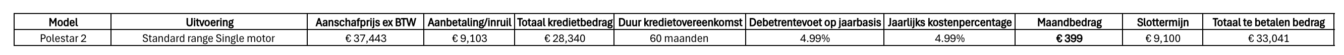 Dit betreft een zakelijk aanbod van Polestar Finance, merk- en handelsnaam van Santander Consumer Finance S.A. - branche Nederland. Klik hier voor de voorwaarden.Toetsing en registratie BKR. Vraag naar de voorwaarden en standaard informatieblad. Polestar treedt op als verbonden bemiddelaar van Polestar Finance. Polestar en Polestar Finance geven geen advies. Je dient zelf te bepalen of het door jouw gewenste financiële product aansluit bij je wensen, behoeften en persoonlijke situatie. Typfouten en prijswijzigingen voorbehouden. Klik hier voor het Privacy Statement. Bekijk hier een voorbeeldcalculatie van een niet-doorlopend kredietaanbod.