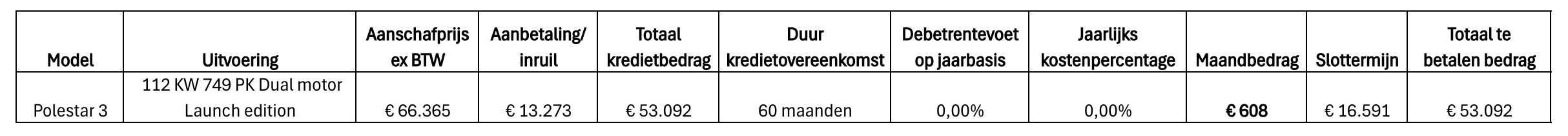 Dit betreft een niet-doorlopend kredietaanbod van Polestar Finance, merk- en handelsnaam van Santander Consumer Finance S.A. – Branche Nederland. Toetsing en registratie BKR. Vraag naar de voorwaarden en standaard informatieblad. Polestar treedt op als verbonden bemiddelaar van Polestar Finance. Polestar en Polestar Finance geven geen advies. Je dient zelf te bepalen of het door jouw gewenste financiële product aansluit bij je wensen, behoeften en persoonlijke situatie. Typefouten en prijswijzigingen voorbehouden. Klik hier voor het Privacy Statement. Bekijk hier een voorbeeldcalculatie van een niet-doorlopend kredietaanbod.