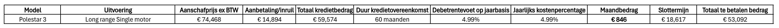 Dit betreft een niet-doorlopend kredietaanbod van Polestar Finance, merk- en handelsnaam van Santander Consumer Finance S.A. – Branche Nederland. Toetsing en registratie BKR. Vraag naar de voorwaarden en standaard informatieblad. Polestar treedt op als verbonden bemiddelaar van Polestar Finance. Polestar en Polestar Finance geven geen advies. Je dient zelf te bepalen of het door jouw gewenste financiële product aansluit bij je wensen, behoeften en persoonlijke situatie. Typfouten en prijswijzigingen voorbehouden. Klik hier voor het Privacy Statement. Bekijk hier een voorbeeldcalculatie van een niet-doorlopend kredietaanbod.