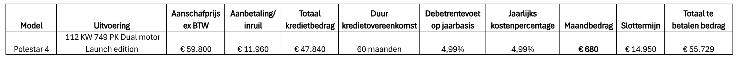 Dit betreft een niet-doorlopend kredietaanbod van Polestar Finance, merk- en handelsnaam van Santander Consumer Finance S.A. – Branche Nederland. Toetsing en registratie BKR. Vraag naar de voorwaarden en standaard informatieblad. Polestar treedt op als verbonden bemiddelaar van Polestar Finance. Polestar en Polestar Finance geven geen advies. Je dient zelf te bepalen of het door jouw gewenste financiële product aansluit bij je wensen, behoeften en persoonlijke situatie. Typefouten en prijswijzigingen voorbehouden. Klik hier voor het Privacy Statement. Bekijk hier een voorbeeldcalculatie van een niet-doorlopend kredietaanbod.