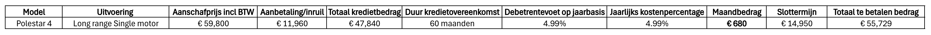 Dit betreft een niet-doorlopend kredietaanbod van Polestar Finance, merk- en handelsnaam van Santander Consumer Finance S.A. – Branche Nederland. Toetsing en registratie BKR. Vraag naar de voorwaarden en standaard informatieblad. Polestar treedt op als verbonden bemiddelaar van Polestar Finance. Polestar en Polestar Finance geven geen advies. Je dient zelf te bepalen of het door jouw gewenste financiële product aansluit bij je wensen, behoeften en persoonlijke situatie. Typfouten en prijswijzigingen voorbehouden. Klik hier voor het Privacy Statement. Bekijk hier voorbeeldcalculatie van niet-doorlopend kredietaanbod.