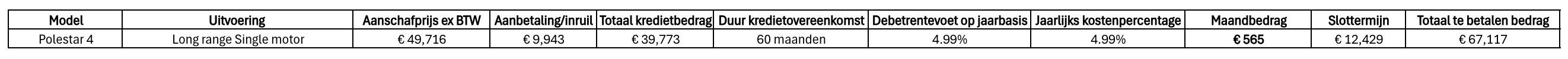 Dit betreft een niet-doorlopend kredietaanbod van Polestar Finance, merk- en handelsnaam van Santander Consumer Finance S.A. – Branche Nederland. Toetsing en registratie BKR. Vraag naar de voorwaarden en standaard informatieblad. Polestar treedt op als verbonden bemiddelaar van Polestar Finance. Polestar en Polestar Finance geven geen advies. Je dient zelf te bepalen of het door jouw gewenste financiële product aansluit bij je wensen, behoeften en persoonlijke situatie. Typfouten en prijswijzigingen voorbehouden. Klik hier voor het Privacy Statement. Bekijk hier een voorbeeldcalculatie van een niet-doorlopend kredietaanbod.