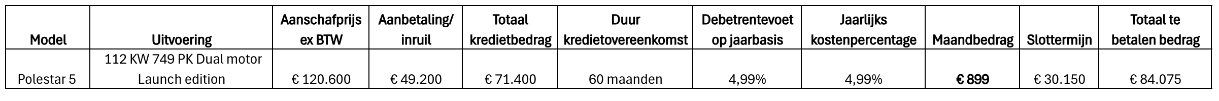 Dit betreft een niet-doorlopend kredietaanbod van Polestar Finance, merk- en handelsnaam van Santander Consumer Finance S.A. – Branche Nederland. Toetsing en registratie BKR. Vraag naar de voorwaarden en standaard informatieblad. Polestar treedt op als verbonden bemiddelaar van Polestar Finance. Polestar en Polestar Finance geven geen advies. Je dient zelf te bepalen of het door jouw gewenste financiële product aansluit bij je wensen, behoeften en persoonlijke situatie. Typefouten en prijswijzigingen voorbehouden. Klik hier voor het Privacy Statement. Bekijk hier een voorbeeldcalculatie van een niet-doorlopend kredietaanbod.