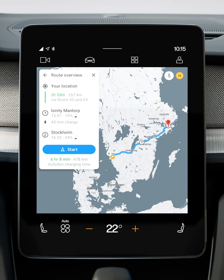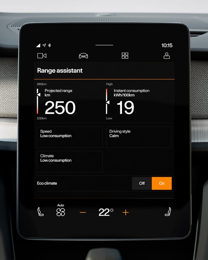 Met slimme hulpmiddelen zoals de Range Assistant-app, voorverwarming van het interieur en een energiebesparende warmtepomp, biedt de Polestar 2 verschillende manieren om de actieradius te vergroten.