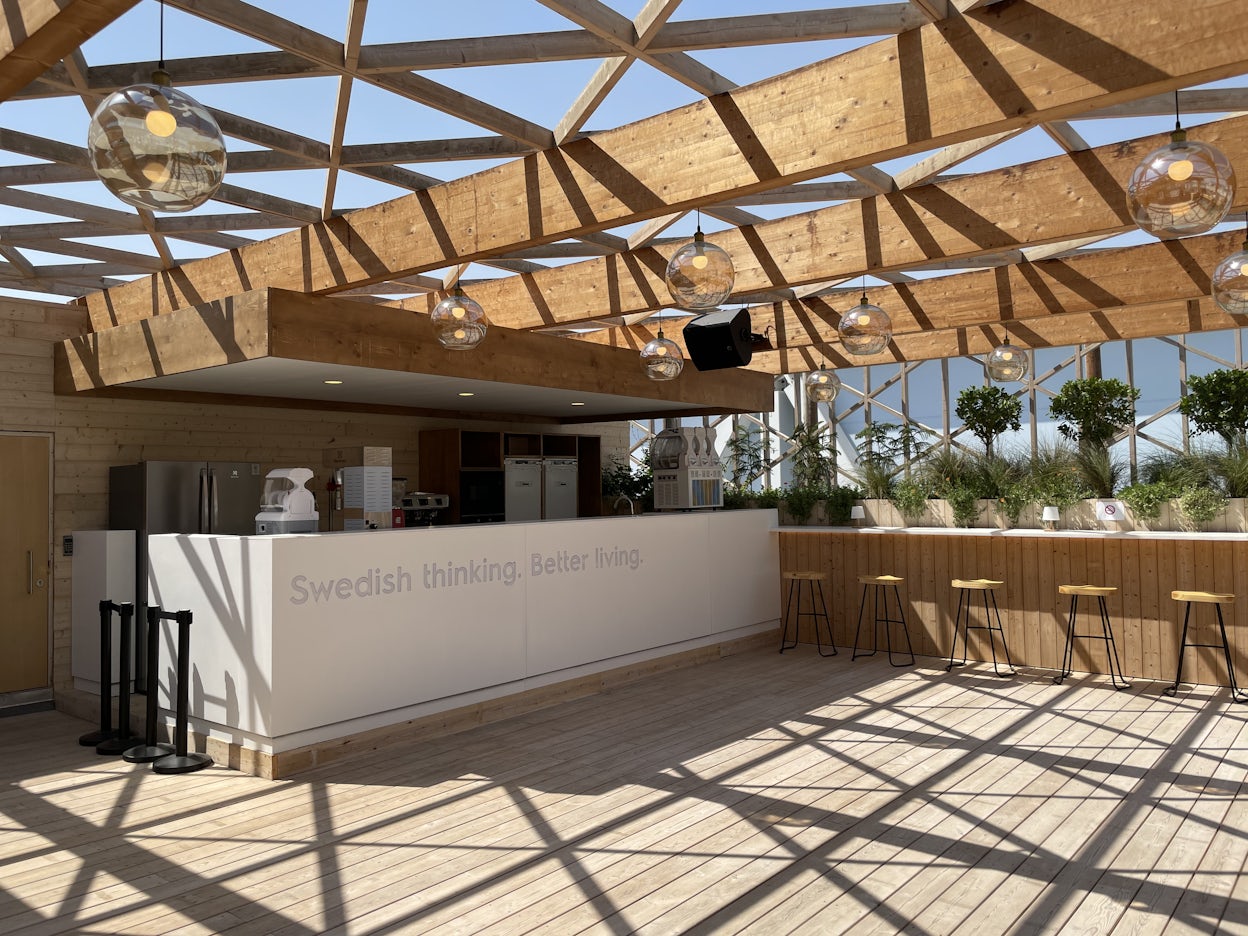 Den svenske pavilijongen er plassert i Sustainability District, og viser frem forskjellige selskaper som fremmer innovasjon innen biovitenskap, smarte byer, biosirkulære økonomier og mobilitet. Som er der vi kommer inn. Som en offisiell partner, har Polestars stand en AI-forbedret skala modell av Polestar Precept, sammen med en rekke videoer som forklarer vår tilnærming til bærekraft, samarbeid og den nære fremtiden innen elektrisk mobilitet. Besøkende går igjennom en skog av trestammer, et symbol for samskaping designet av Alessandro Ripellino Architects, Studio Adrien Gardère, og Luigi Pardo Architetti - med med stubber istedet for sokler. Paviliongen som er bygget av alternative materialer er "en funsjon av tett nordisk skogslandskap og islamsk geometrisk design". Det estimeres at man har spart cirka 1,000 CO2e ved å unngå å bruke tradisjonelle materialer under konstruksjon av paviliongen.