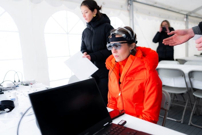 Mote- og livsstilsinfluenser Nina Sandbech ble utstyrt med tilbehør som skilte seg en god del fra det hun vanligvis styler seg med. Hatter og solbriller fra luksusmerker ble erstattet med EEG-sensorer som måler de elektromagnetiske bølgene i hjernen og eyetracking-briller som fanger opp hvor blikket er festet til enhver tid.