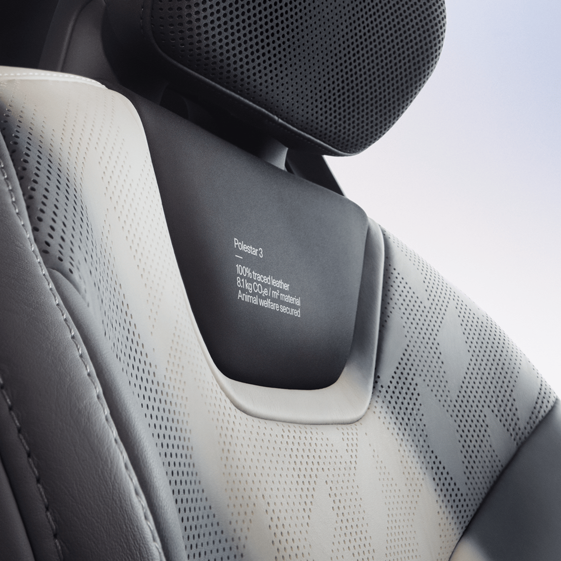 • close up of the Polestar 3’s upholstery sustainability declaration on a seat.