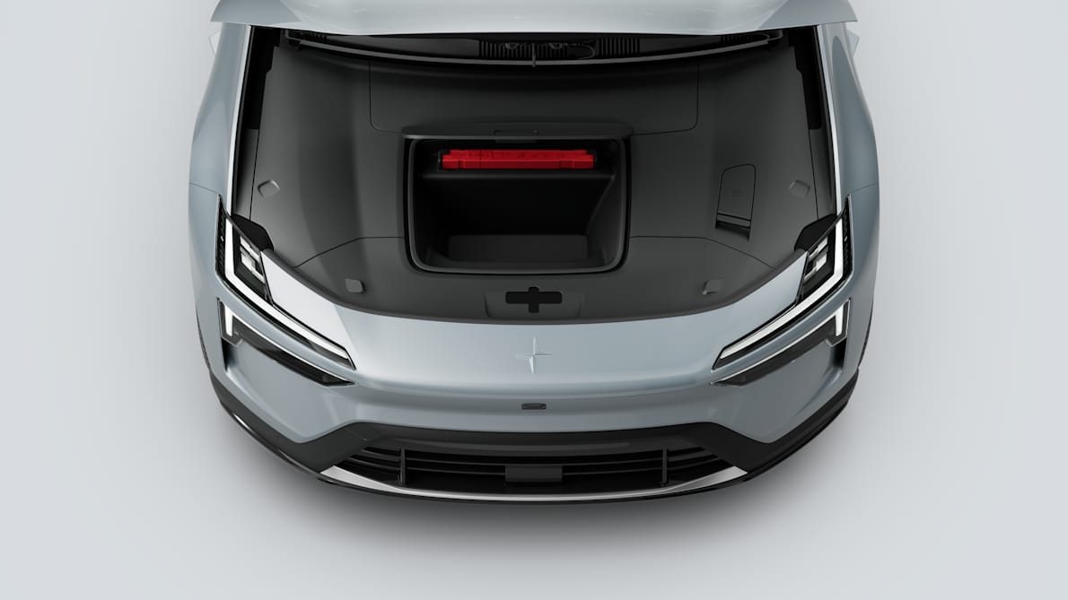 Når baksetene legges ned, utvides det totale volumet fra 526 liter til 1536 liter, og det virtuelle vinduet i Polestar 4 gjør at lasten kan stables til randen uten å blokkere sikten bakover. Under gulvet er det plass til mindre gjenstander, og gulvnivået kan justeres etter lasten.