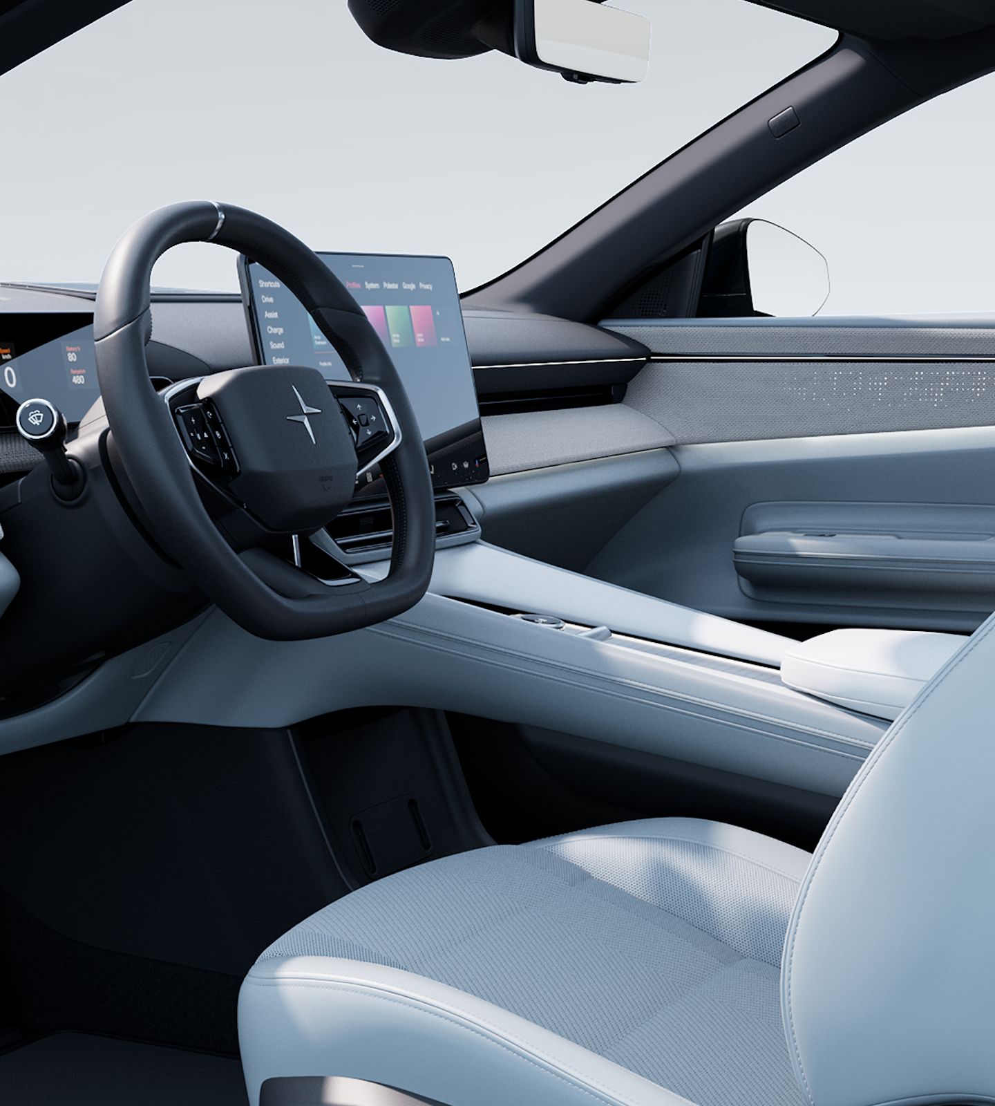 Skandinavisk minimalisme. Innovativ komfort. Og interiørbelysning som bokstavelig talt er utenomjordisk. Interiøret i Polestar 4 er preget av skreddersydde tekstiler og atmosfæren som skapes av det virtuelle bakvinduet og belysning inspirert av solsystemet.