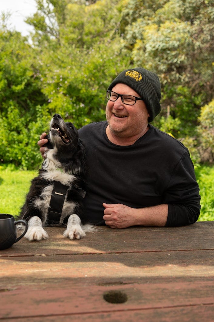 Stan and his pet dog sit at a table in his backyard on Kangaroo Island