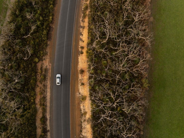 A bird's eye view of Stan's Polestar 2 driving the winding roads of Kangaroo Island