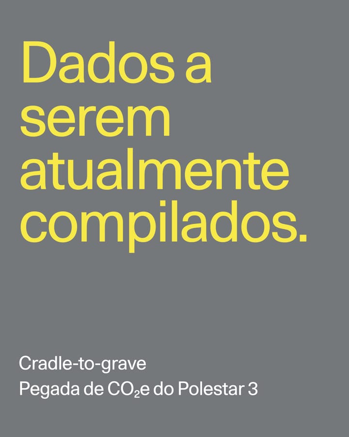 São utilizados vários materiais diferentes para fabricar um Polestar 3, por exemplo, alumínio, aço, eletrónica e plásticos. Cada categoria de material contribui para a pegada de carbono total do veículo, assim como a mistura de eletricidade usada na produção e no refinamento. O nosso objetivo é reduzir continuamente o impacto de carbono e melhorar a precisão dos nossos cálculos da pegada.