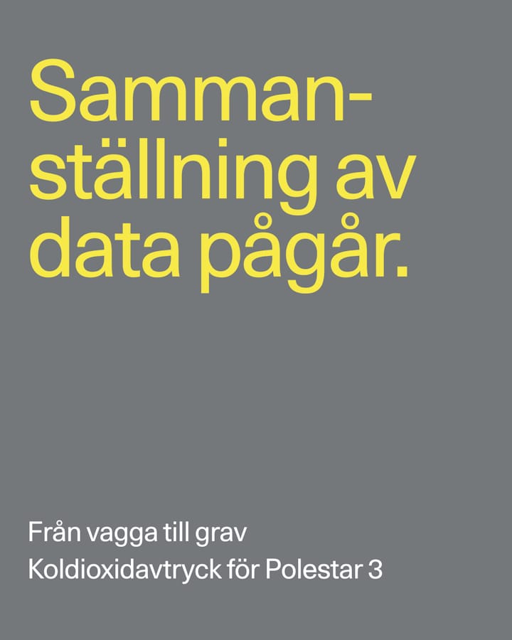 Polestar 3-bilar tillverkas av många olika material, såsom aluminium, stål, elektronik och plast. Varje materialkategori bidrar till bilens totala koldioxidavtryck, och detsamma gäller för den elmix som används vid produktion och bearbetning. Vi strävar efter att kontinuerligt minska koldioxidpåverkan och förbättra beräkningarna av koldioxidavtrycket.